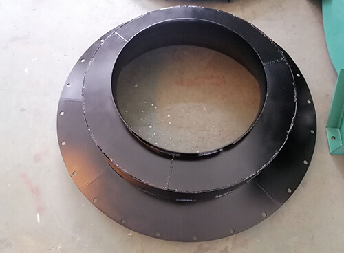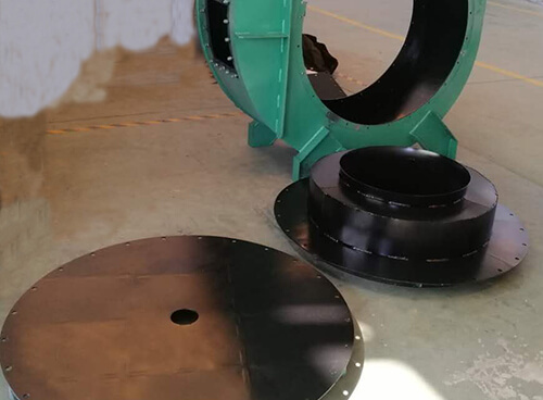 風機主要由葉輪、機殼、電動機等零部件組成,支架采用型鋼與機殼風筒連接。風機葉輪、機殼多采用鋼板製成,當葉輪旋轉時,氣體從進風口軸向進入葉輪,受到葉輪上葉片的推擠而使氣體的能量升高,然後流入導葉,在風機運轉過程中,風機機殼收內外作用的影響,容易受到磨損腐蝕。