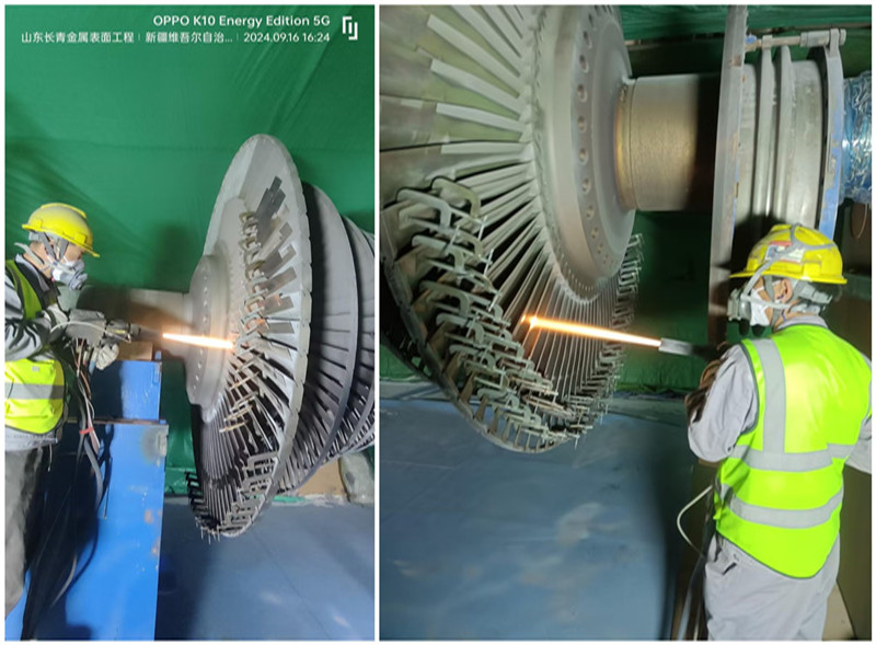 濟南天盟新材料科技有限公司承接的新疆某電廠汽輪機葉輪耐腐蝕塗層現場噴塗項目進行中。